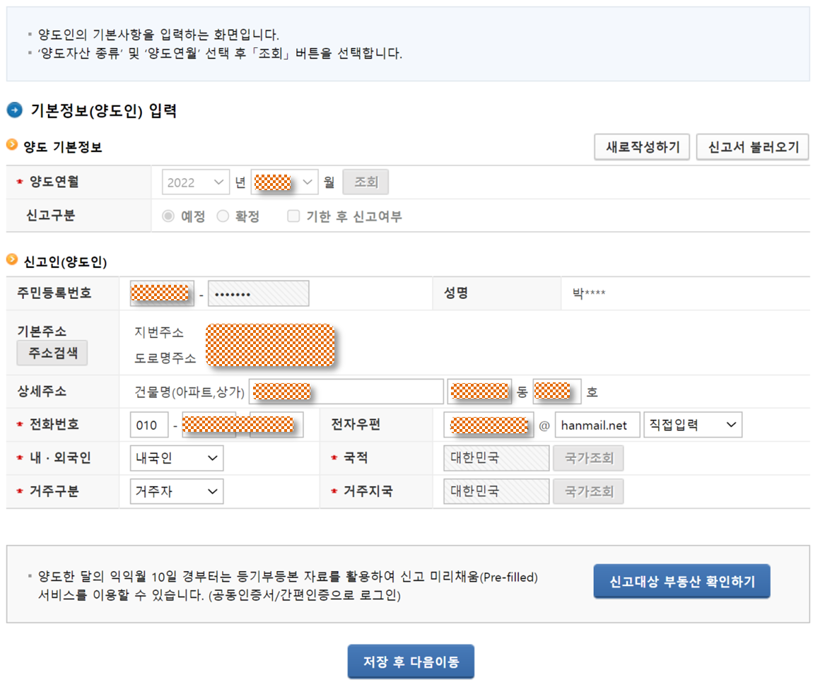 우선 다음과 같이 양도인에 대한 기본정보를 입력합니다.