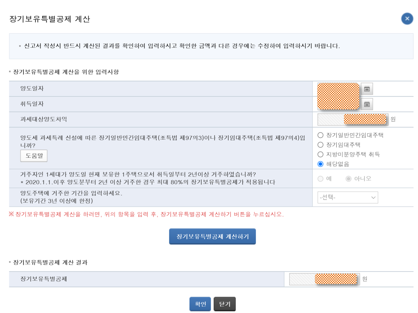 다음으로 (5)번 항목에 있는 '장기보유특별공제 계산기' 버튼을 클릭하여 장기보유특별공제액을 계산합니다.