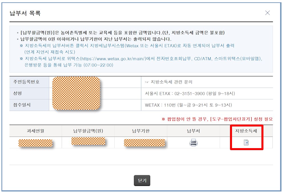 납부서 목록에서 '지방소득세' 아이콘을 클릭합니다.