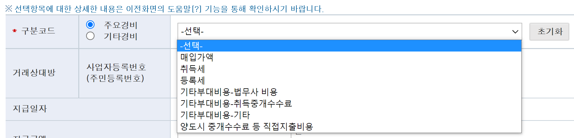 매입가액과 해당된는경비를 선택한 후, 하나 하나씩 입력합니다.