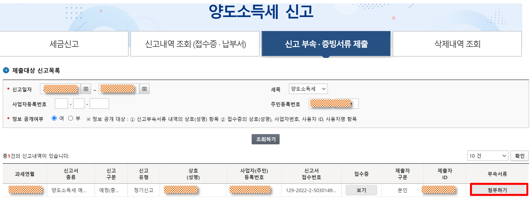 그리고 제출대상 신고목록에서 관련 정보를 입력하고 '조회하기'를 클릭하면