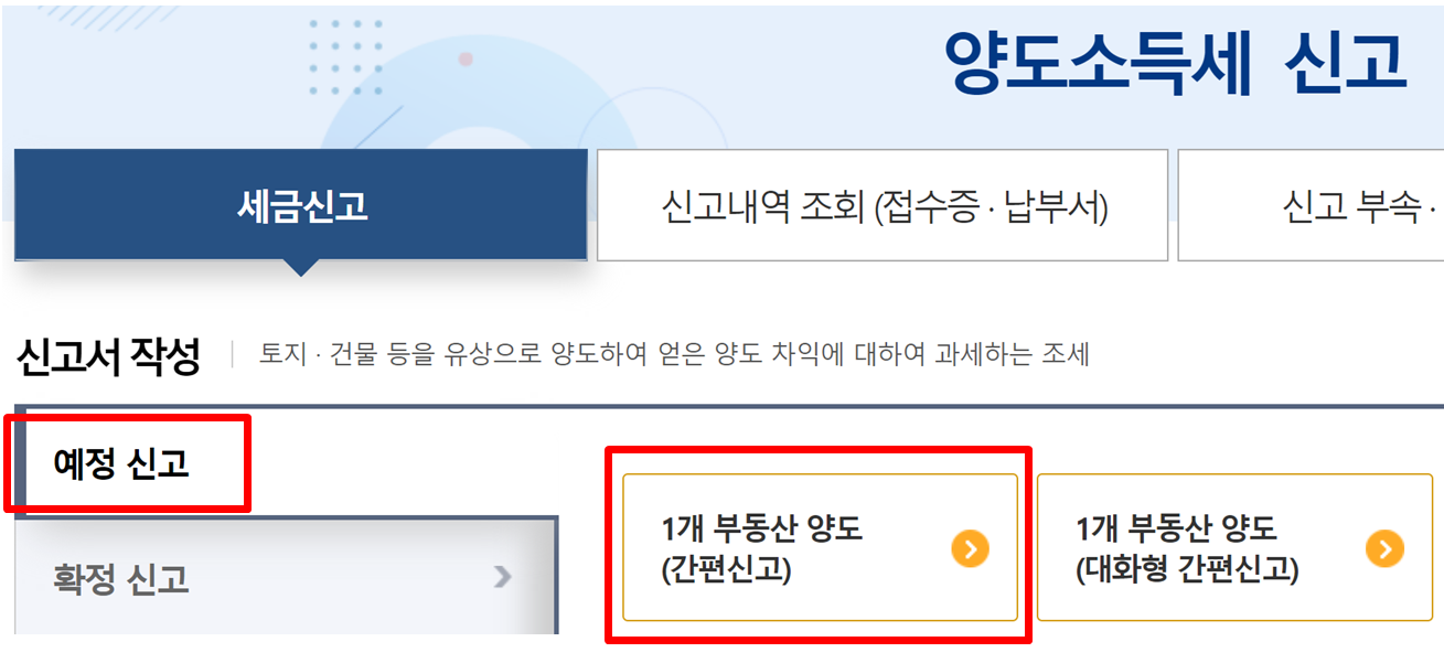 ※ 참고로 예정신고는 쉽게 말하면 1년에 한 건의 양도소득세 신고할 경우를 말합니다.