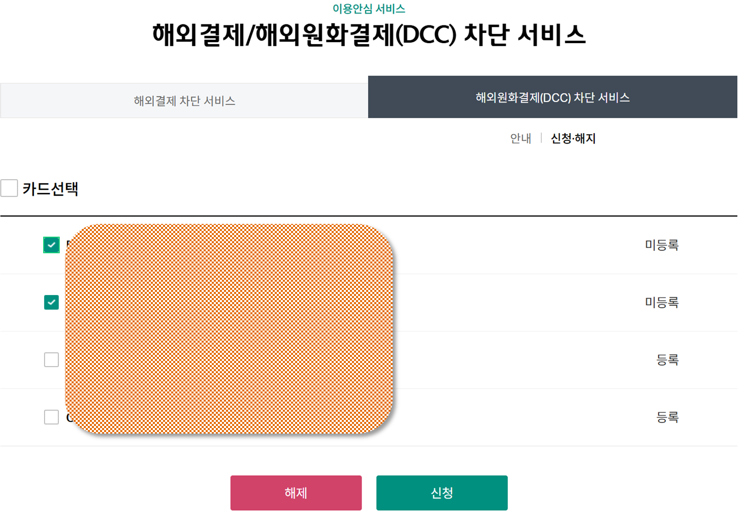 | 구분 | 해외 결제 차단 | 원화 결제 차단(DCC 차단) |