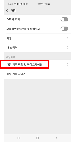 채팅 관련 세부 메뉴 안에 채팅 기록 백업 및 마이그레이션 항목이 있습니다.